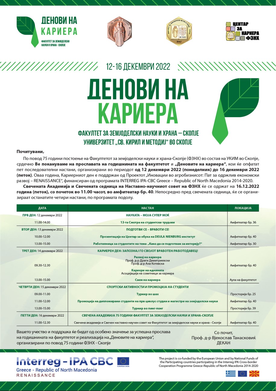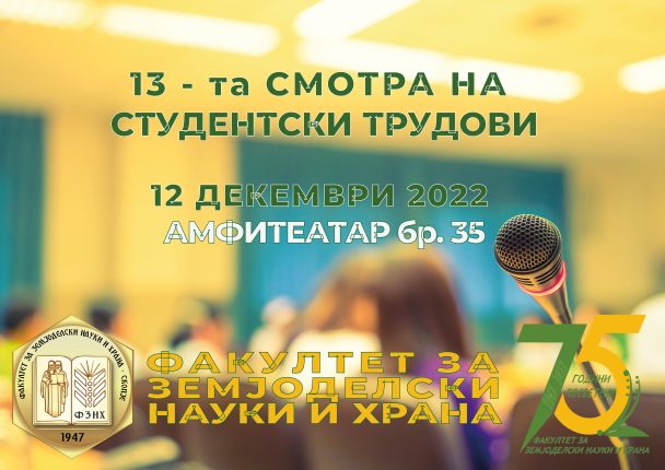 Ни претставува особено задоволство и чест да ве поканиме да бидете дел од серијата настани кои се на програмата од 12.12.2022 до 16.12.2022 година, а во чест на роденденот на Факултетот за земјоделски науки и храна-Скопје „75 Години ФЗНХ“.